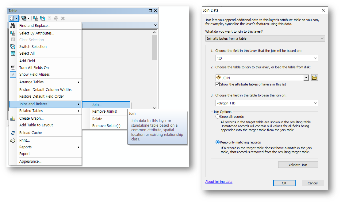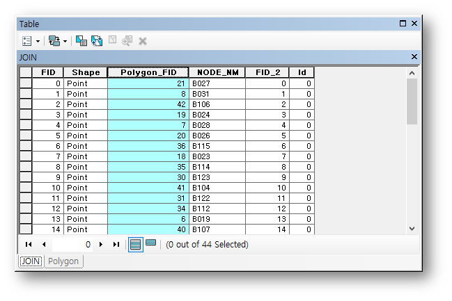 >폴리곤 테이블에 조인 쉐이프 필드 Ploygon_FID기준으로 조인을 수행