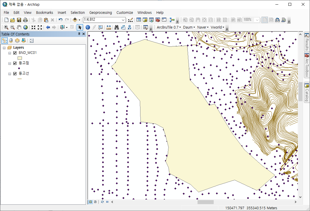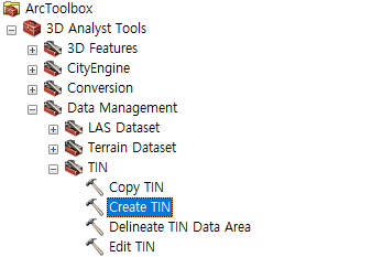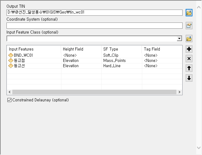 TIN(Triangle Irregular Network) 생성을 위해서는 표고자료가 우선적으로 필요하며 정해진 경계를 기준으로 경계 내부의 TIN을 생성하고자 한다면 경계자료 또한 필요하다.