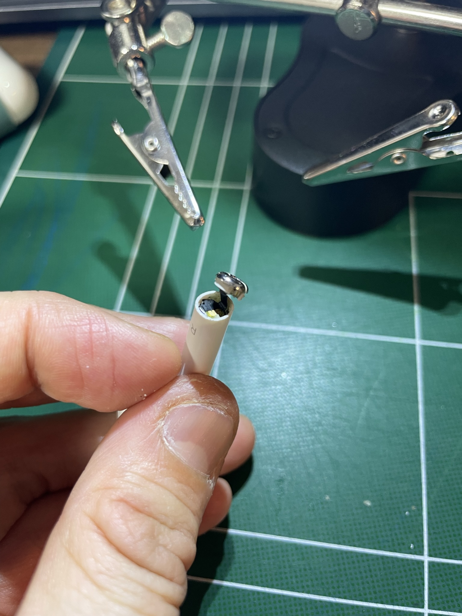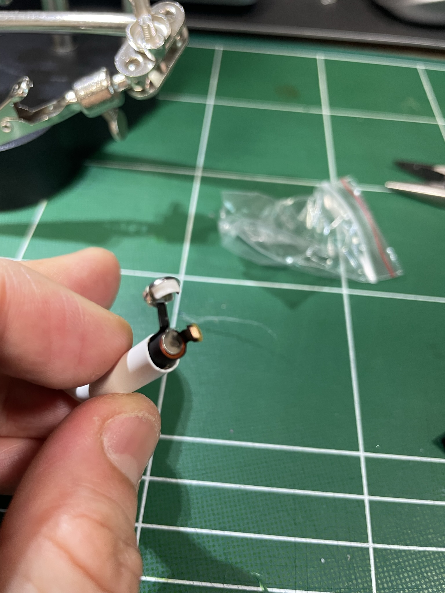 다만 본체 플라스틱이 인두기와 닿으면 녹으므로 주의하여 열을 가한다(작업하는 손도 조심, 인두기 근처에 그 어떤것도 조심).